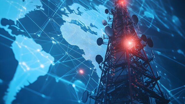 A close-up of a telecommunications tower with satellite dishes and antennas, with a world map overlay showing global connectivity lines and network nodes