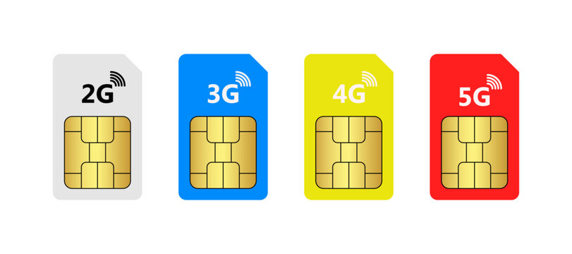 Set of four colored SIM cards showing 2G, 3G, 4G, and 5G mobile network technologies vector graphics