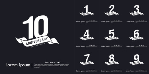 Set of 1-10th years anniversary celebration emblem. white anniversary logo isolated with ribbon on black background. monotone color. vector illustration template design