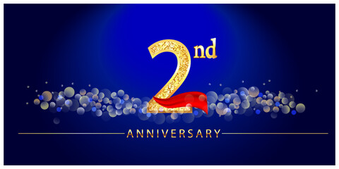 2 anniversary celebration. 2nd anniversary celebration. 2 year anniversary celebration logo with glitter, confetti, red ribbon and blue background.