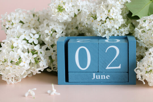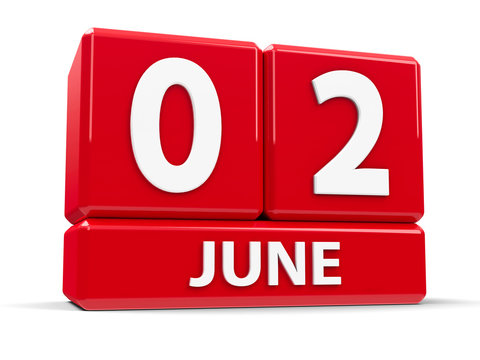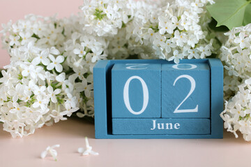 June 2nd. June 2 wooden cube calendar with blur objects on background.