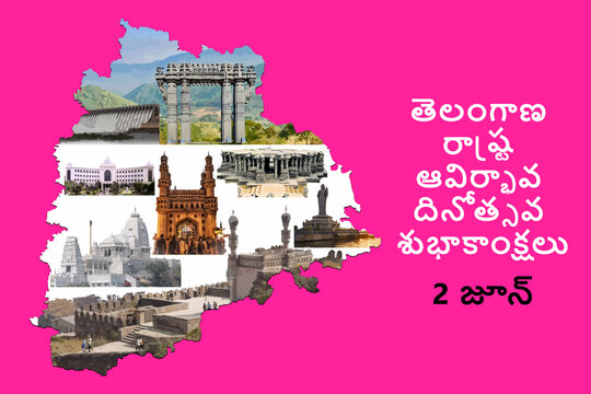 Telangana State Formation Day greetings. Telangana Avirbhava Dinotsavam. Text translates to Happy Telangana State Formation Day 2nd June