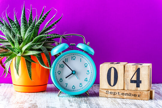 Wooden calendar with the date September 4.Monthly calendar for planning and management concept with alarm clock on wooden background