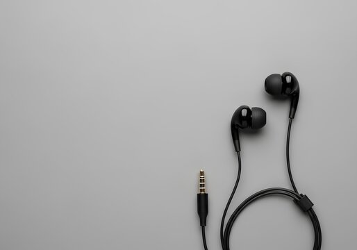 Classic black wired in-ear headphones with a 3.5mm audio jack neatly arranged on a flat gray background, top-down view.
