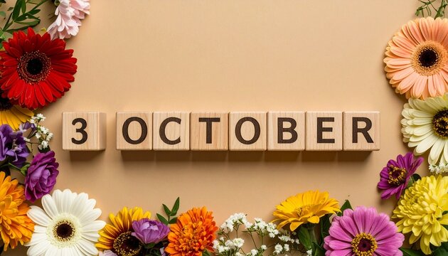 Wooden Blocks with Date 3 October. Floral Calendar – Vibrant Flowers on Solid Colored Background