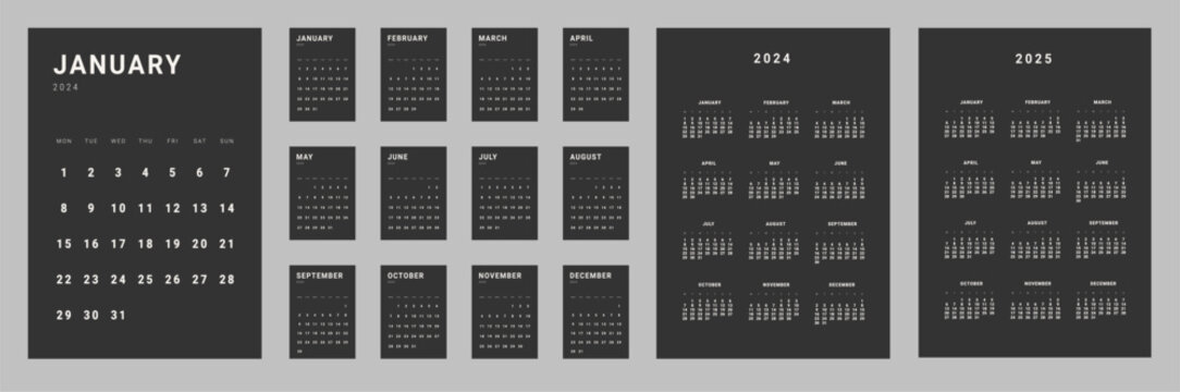 Set of monthly calendar planner page templates for 2024. Isolated Vector layout minimalist of wall or desk calendar with week start on Monday for print. Page for size A4 or 21x29.7 cm in dark color.