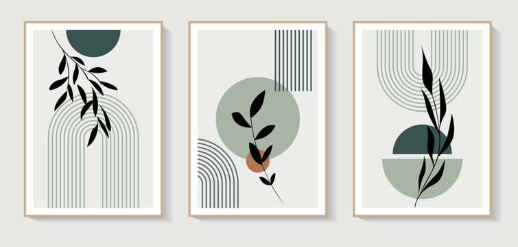 Set of 3 Minimalist wall art. Abstract geometric prints for boho aesthetic interior. Home decor wall prints, terracotta colors. Sun, rainbow and clay pots. Contemporary artistic printable vector