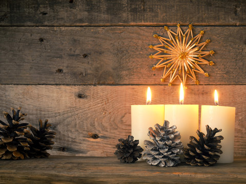 Calendar with text 3 DAYS UNTIL HOLIDAYS, burning candle and Christmas decorations on piano keys, closeup