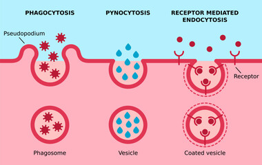Endocytosis. Phagocytosis, pinocitosis, receptor mediated endocytosis. Three major types of endocytosis. Cell eating, cell drinking, receptors coated pit on cell membrane. Vector illustration.