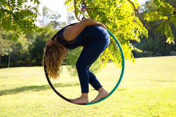 Blonde woman and young gymnast acrobat athlete performing aerial exercise on air ring outdoors in park. Flexible woman in red costume performs poses of circus performers dancing with hips.
