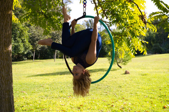 Blonde woman and young gymnast acrobat athlete performing aerial exercise on air ring outdoors in park. Lithe woman in blue costume performs poses of circus performers dancing with hips