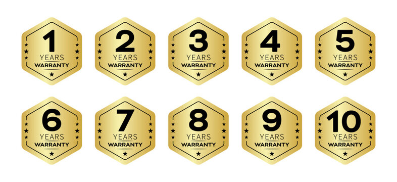 Warranty 1, 2, 3, 4, 5, 6, 7, 8, 9, 10 years months days hour label, logo, badge, icon, sticker, emblem, stamp, symbol, black, golden, flat vector, isolated illustration.