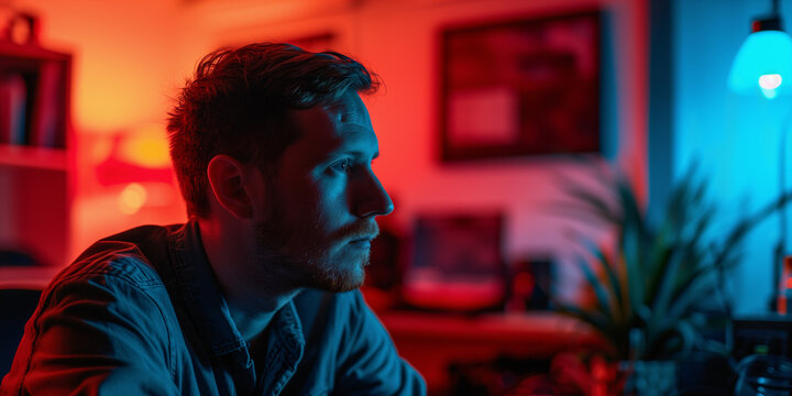 Profile of a contemplative man in a room bathed in red and blue light, creating a moody and cinematic atmosphere