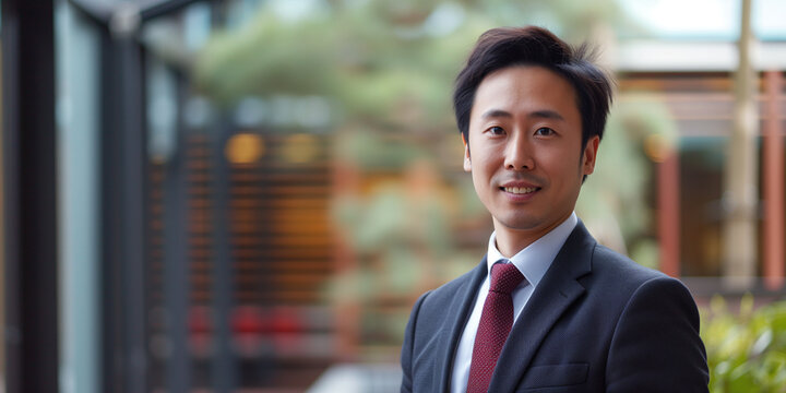 Smiling Asian man in business attire, with a blurred natural and architectural background