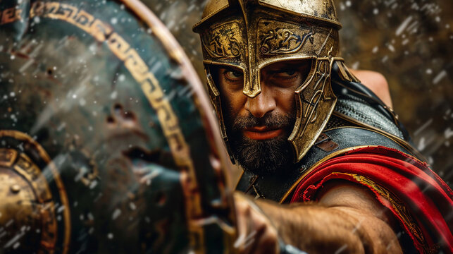 Illustration of spartan warrior in armor with shield and sword, masculine antique Greek military, muscular ancient soldier, realistic ai generated art