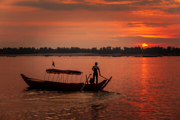 DOLPHIN WATCHING, MEKONG RIVER, KRATIE PROVINCE, CAMBODIA - 31 January 2012: Local dolphin watch boat opperator watches beautiful sunset at end of his day.