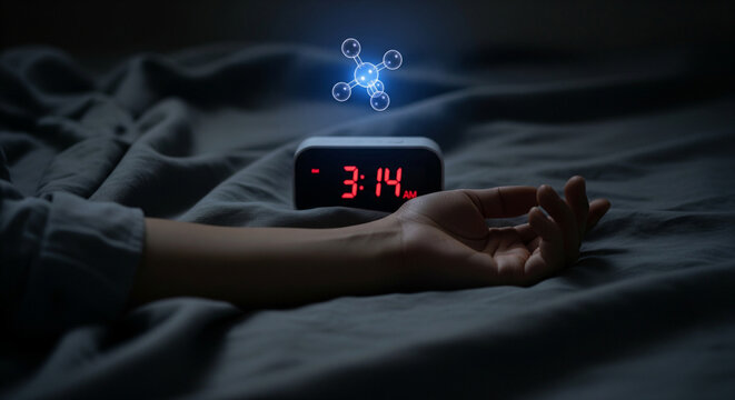 A persons hand resting on a bed next to a digital alarm clock displaying 314 am, with a glowing drone icon hovering above, suggesting latenight or earlymorning drone activity or technology integration