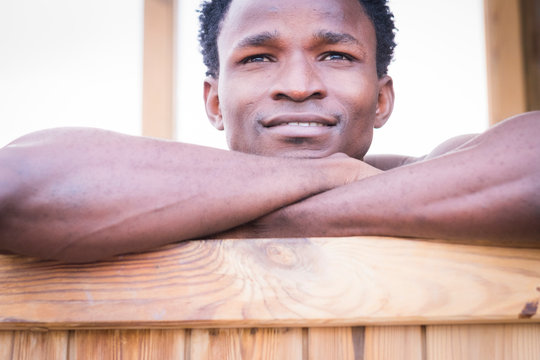 Beautiful black afro race ethnic male smile and relax on a wood bar. close up portrait of young millennial people enjoy the life and the age. Beautiness and model concept