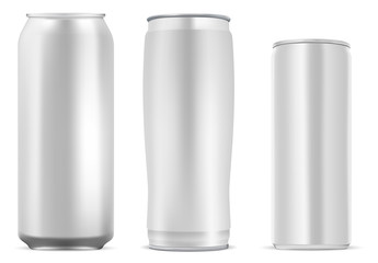 Aluminum cans realistic. Metallic blank beer or soda, water or juice can, silver empty drink packaging 300 330 500 ml. Marketing branding container mockup collection. Vector isolated set