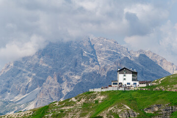 View of Rifugio Auronzo in the Dolomites, Italy. The mountain house is situated at an altitude of 2,333 m on the South side of the massif of the Three Peaks and can easily be reached on foot or by car