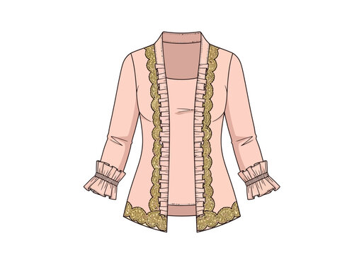 Pink blouse  top Scalloped gold trim edges open jacket Ruffled 34 sleeves