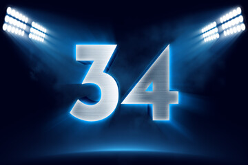 Number 34 background, 3D 34 object made of metal, illuminated with floodlights