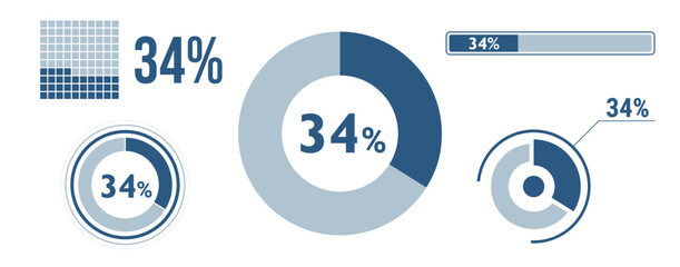 34% percentage infographic set. Thirty-four circle diagram, pie donut chart, progress bar. 34 percent loading data icon. Vector concept collection.