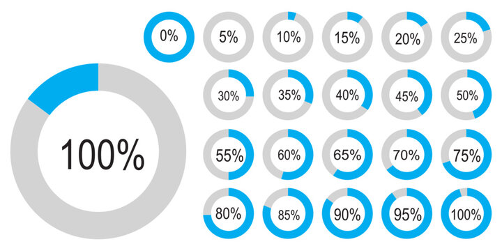 Infographic circle with percentage 0 to 100 loading progress interface in blue color vector design. 5 10 15 20 25 30 35 40 45 50 55 60 65 70 75 80 85 90 95 percent loading circle collection.