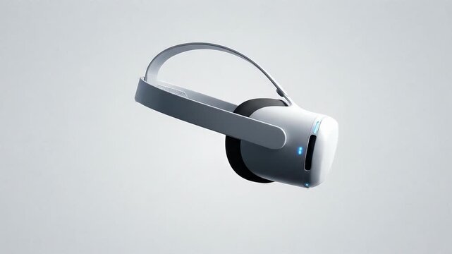 Futuristic VR headset rotating in 3D space, virtual reality goggles spin on light background, modern immersive technology concept, augmented reality device animation, minimal design loop