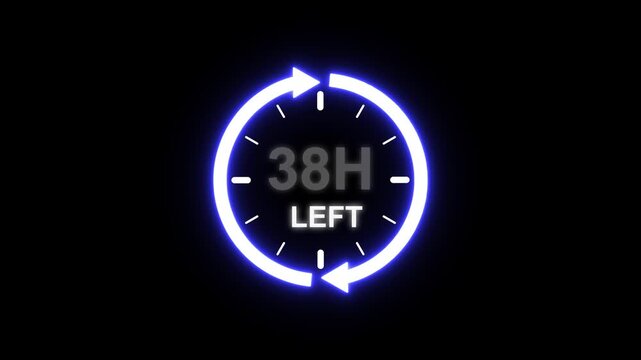 Neon blue glowing clock icon with 38 hours left countdown on black background timer time