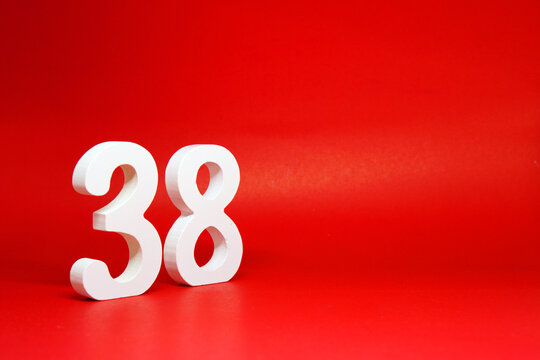 Thirty Eight ( 38 ) white number wooden Isolated Red Background with Copy Space - New promotion 38% Percentage  Business finance Concept