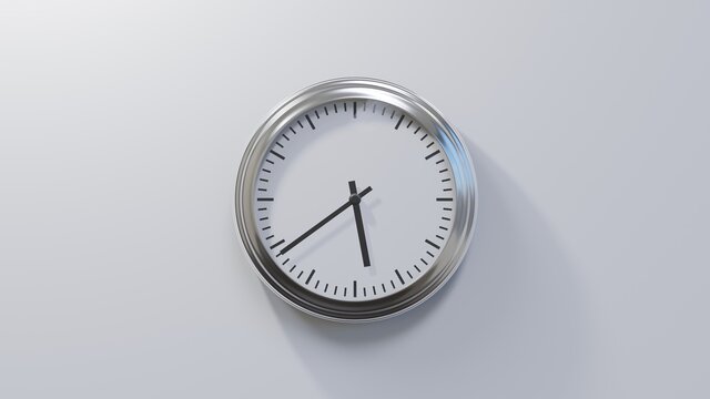 Glossy chrome clock on a white wall at thirty-nine past five. Time is 05:39 or 17:39