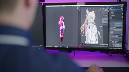 Graphic designer and 3d animator work at computer in office