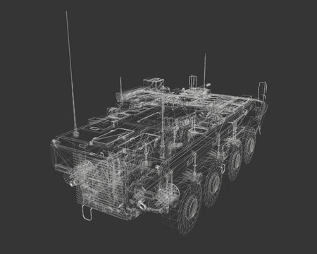 Armored personnel carrier 3D model on black background, featuring detailed wireframe structure for military applications.