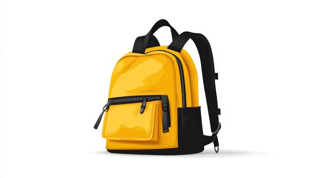 Realistic yellow backpack with black zippers. Vector object in different positions. Bag of schoolboy, student, view from different sides. Color icons for web design