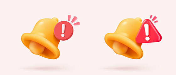 3d render set bell reminder. Three-dimensional collection alarm icon vector illustration. Alert message notification. Notice of calls, new chat, newsletter, mail, social media message in application.