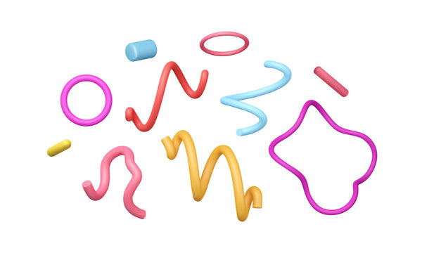 3d graphic elements set. Wavy line, circle, gradient sticks. Party decoration, bright swirl, artistic plastic doodle render. Vector illustration. Geometric shapes.