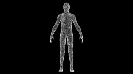 3D human body man on black bg. Object dissolved white flickering particles. Business advertising backdrop. Science concept. For title, text, presentation. 3D animation