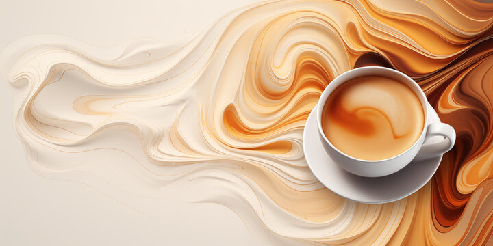 Abstract 3D coffee background, a cup of coffee against a background of soft waves and lines in brown tones, latte art, top view
