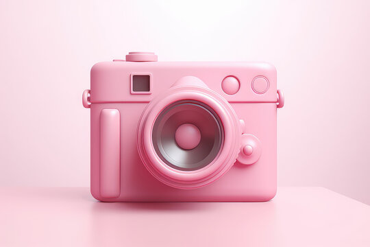 Cute camera ui icon, pink frosted glass plastic style. Simple 3d photo camera on pastel light pink background. Generative AI 3d rendering illustration imitation.