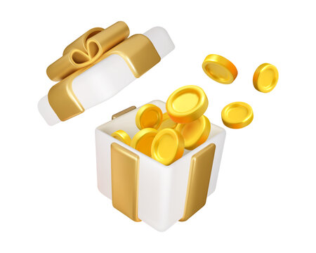 Vector 3d gift box with flying golden coins. Cartoon present icon with gold money, reward idea. Bonus money prize illustration, isolated on white background