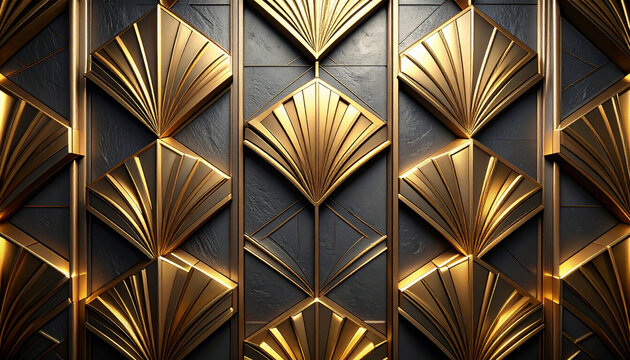 金の扇形装飾と黒大理石が交差するアールデコ壁