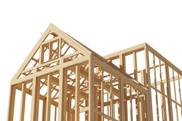 Wooden house frame in construction against a white background. Concept of building, architecture, and construction. 3D Rendering