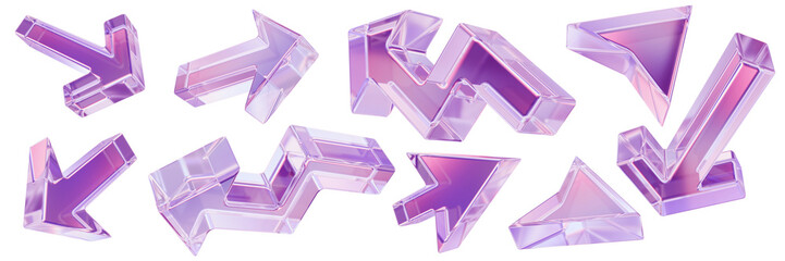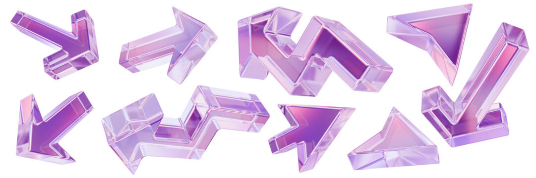 3D glass arrow set, transparent UI cursor icon, crystal purple y2k glossy direction emblem, pointer. Game interface pictogram, website click navigation shape, modern web button. 3D arrow collection