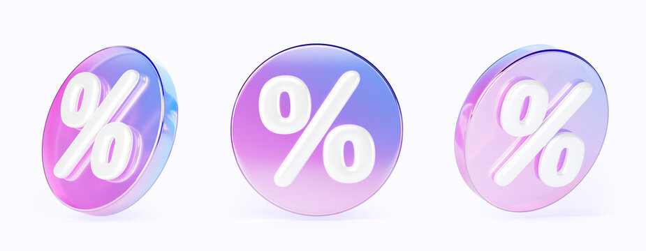 3d set of glass holographic circle sale tag or label with percent sign. Rainbow round shopping discount badge with percentage render icon. Crystal bonus, price or offer with gradient. 3D illustration