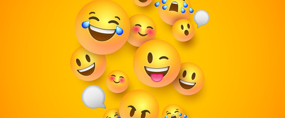World Emoji Day Concept. 3d smiling emoticon or Smiley yellow ball emoji on yellow background. Funny emojis. World smile day emojis. World mental health day.  World Laughter Day. Copy space for text