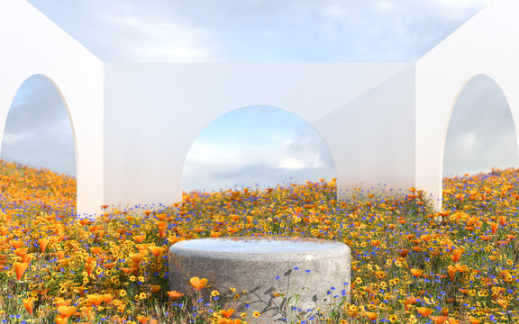 Abstract natural field scene with podium for product display and frosted glass background. 3d rendering