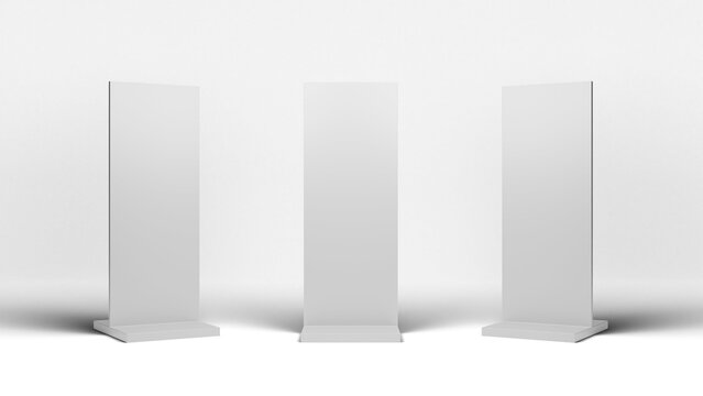 Realistic promo stands. Empty tents, white panels and display. Showroom or street market stalls. 3D promotional expo flags mockup vector set. Illustration promo empty counter, portable mock up