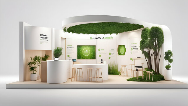 3d render exhibition booth with nature theme. Exhibition stand mockup template