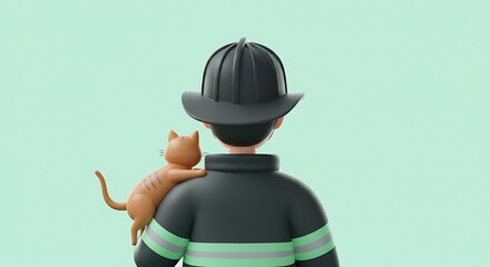 3d cartoon illustration, fireman in helmet holding rescued cat, viewed from behind, subject at bottom with mint green tones, clear copy space at top. ,isolated on bright background